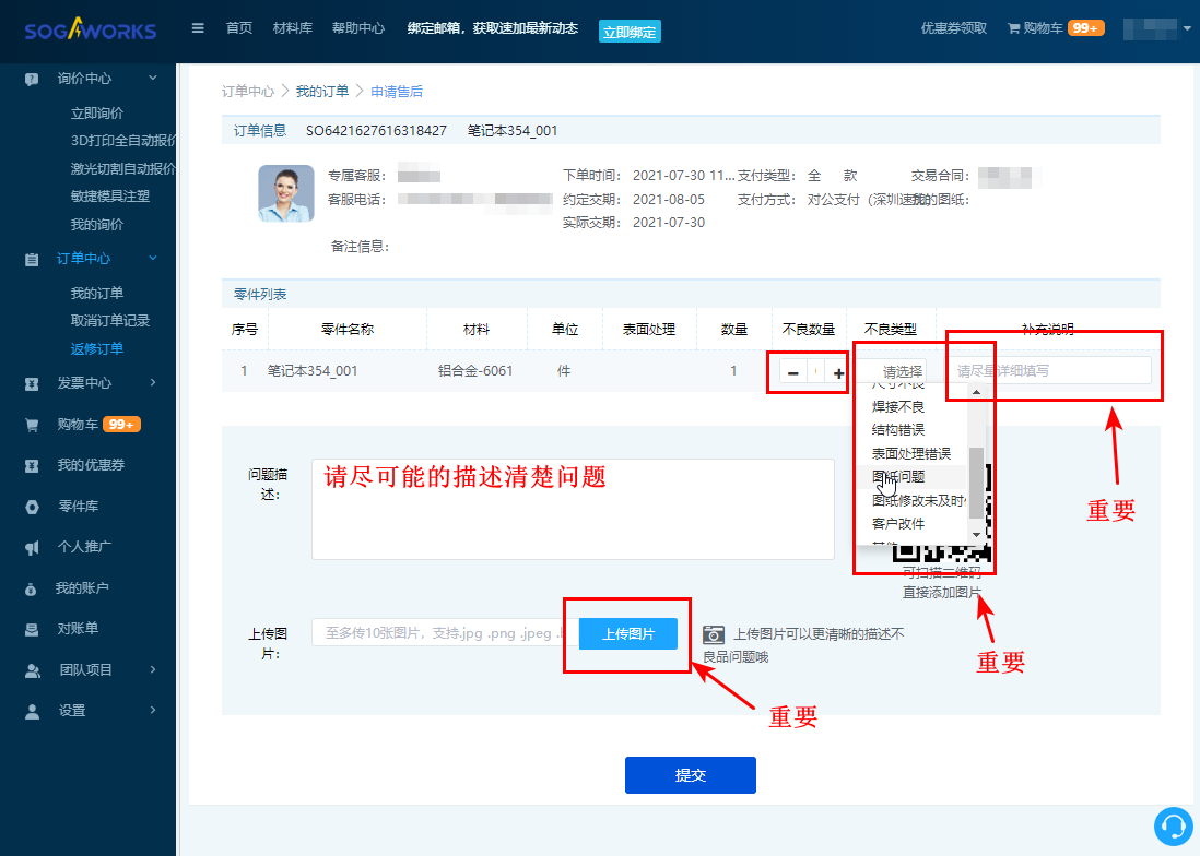 2.零件寄回時(shí),請(qǐng)務(wù)必將訂單號(hào)、專屬售前的名字寫在卡片上隨貨一起寄回。