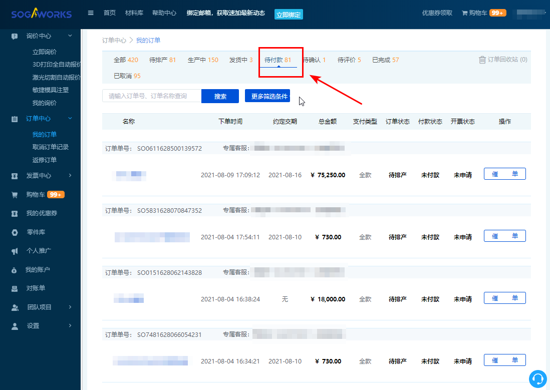 3. 點(diǎn)擊【待付款】,進(jìn)入代付款訂單列表