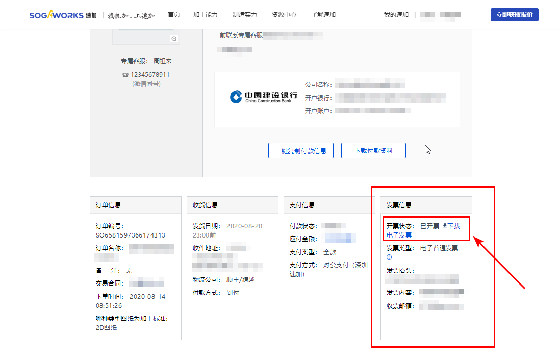 4. 進入訂單詳情頁面,在【發(fā)票信息】處,點擊【下載電子發(fā)票】即可